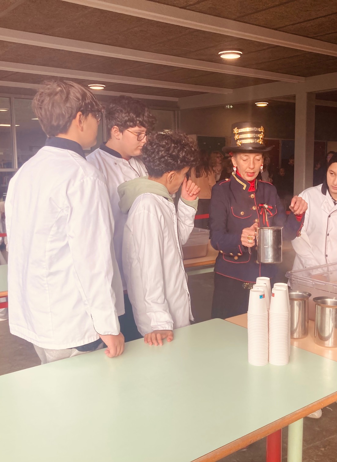 Les élèves du collège ont pu bénéficier gratuitement d'un chocolat chaud préparé pour l'occasion par les équipes de restauration et servis par les élèves de 301, en tenue. Les élèves de 3e segpa ont ainsi pu mettre en pratique les compétences travaillées tout au long de l'année lors des ateliers VDL et HAS. Un grand merci aux élèves, aux équipes ainsi qu'aux enseignantes pour ce temps de convivialité partagé.
